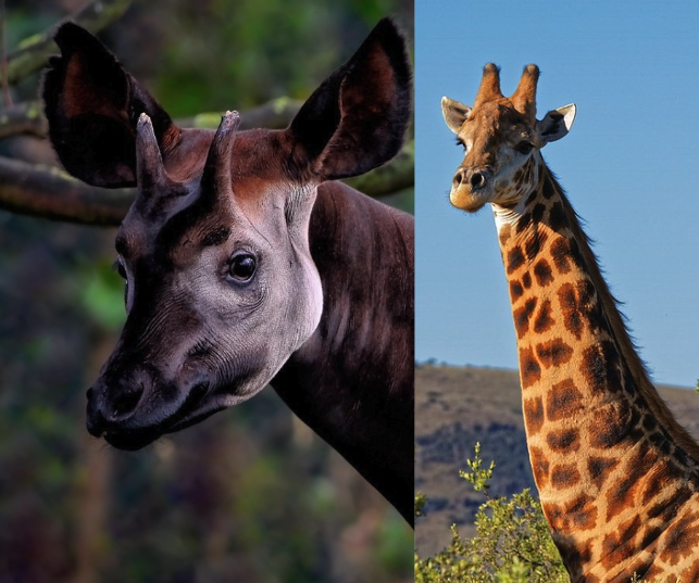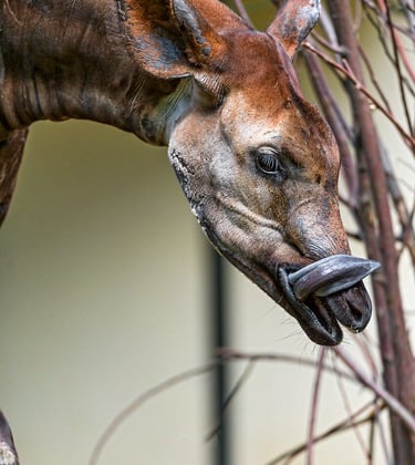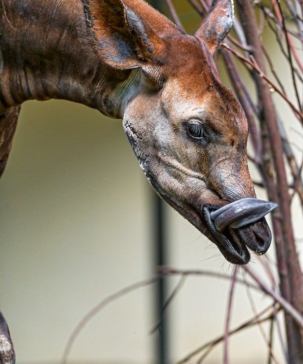 Despite their zebra-like stripes, okapis are actually the only living relatives of giraffes. They share distinctive long, blue-black tongues extending up to eighteen inches, which strip leaves from branches and even clean their own eyes and ears with remarkable dexterity.